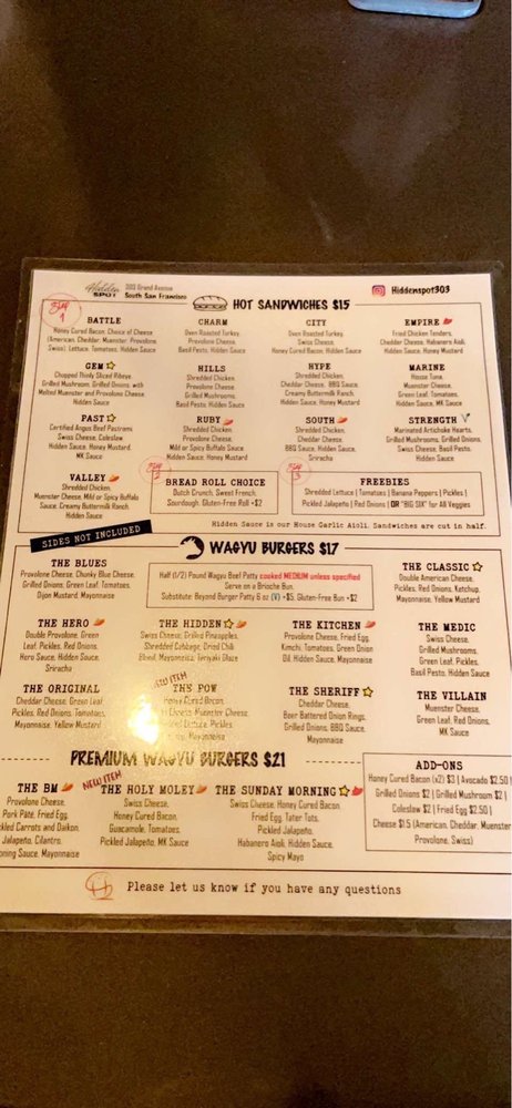 Hidden Spot - South San Francisco offers a diverse menu featuring mouthwatering hot sandwiches and gourmet Wagyu burgers. The ambiance is described as hipster, casual, and trendy, with options for outdoor seating and a full bar. Customers rave about the delicious Honey Garlic Butter Chicken Wings and the Turkey Charm sandwich. The unique flavors and generous portions make this spot a hidden gem in South San Francisco. The fusion of ingredients in the premium Wagyu burgers like The BM and The Holy Moley creates a memorable dining experience. The local vibe combined with attentive service adds to the overall appeal of Hidden Spot. Whether you're looking for a quick bite or a casual dining experience, Hidden Spot is a must-visit destination in South San Francisco.