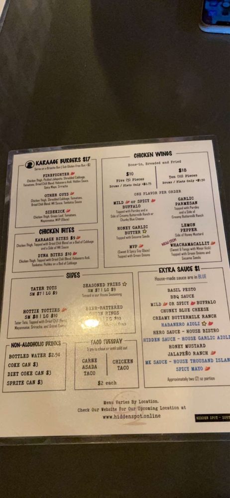 Karaage Chicken, Pickled Jalapeo, Shredded Cabbage, Tomatoes, Dried Chili Blend, Habanero Aioli, Hidden Sauce, Spicy Mayo, Sriracha